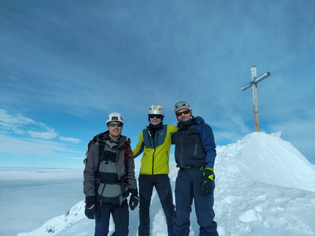 On pique-nique en haut. Il n’y a pas de vent donc on n’a pas trop froid. On parle avec d’autres groupes qui ont fait la croix à la journée, soit 1800 de D+. L’un d’eux glisse au moment d’enlever ses skis et se rapproche de la falaise avant de se rattraper. Ça le fait rire mais nous ça nous a mis un petit coup de chaud.