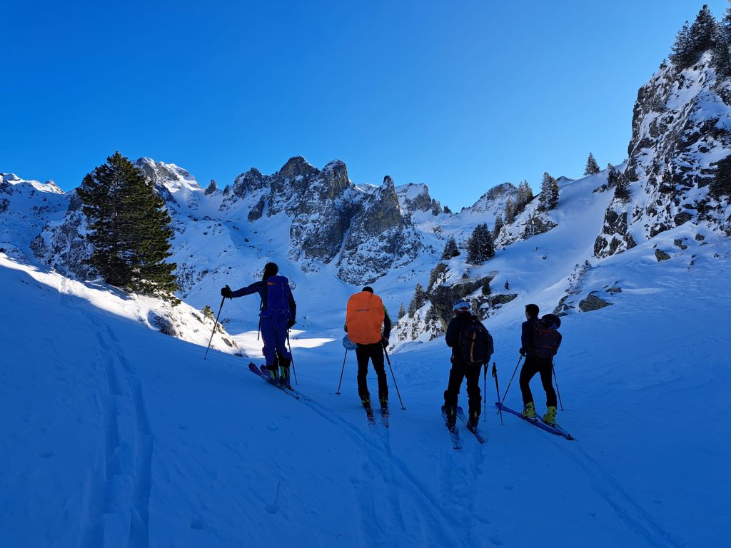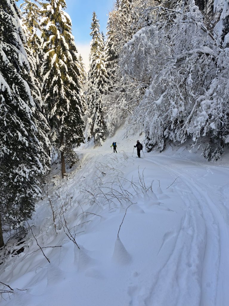 Après avoir croisé deux biches et un chamois, la quantité de neige n’est plus suffisante pour skier. Il faut qu’on finisse à pied. On s’en rend compte quelques dizaines de mètres trop tard, après avoir arraché quelques poils à nos peaux qu’on avait gardées sur la piste enneigée.
