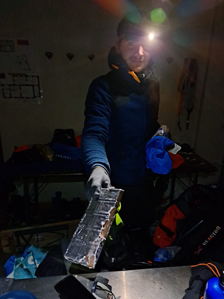 En revanche, la nuit tombe vite. On finit dans le noir, les nuages et le froid, à la frontale. Avec le peu de visibilité, on galère bien à trouver le refuge Jean Collet. Dans le brouillard, tous les rochers ressemblent à des cabanes avant qu’on s’en approche. Heureusement qu’on a la montre GPS de Nicolas pour nous guider. On fait l’erreur de se séparer à un moment, jusqu’à ce que je ne voie ni n’entende plus Vivien et Nicolas. A ce moment je stresse un peu, je sors mon téléphone pour voir où est le refuge sur Google maps. Au même moment j’entends à peine l’écho de la voix de Vivien qui m’appelle. Je le rappelle et j’avance en direction de sa voix jusqu’à revoir la lueur de leurs lampes frontales. Ils récupèrent de l’eau dans une rivière et ont repéré le refuge. Tout va mieux, même si je me rends compte que dans la précipitation pour les rejoindre, j’ai perdu un sous gant. Heureusement Vivien est là. Son sac est petit, 30 L, mais c’est le sac d’Hermione Granger : il en sort un sous gant de secours.