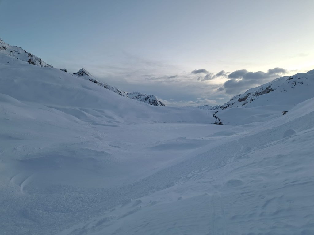 En montant au col de la vache, le vent se met à souffler de plus en plus fort. Dans ces moments, c’est important de bien gérer les couches de vêtements pour avoir suffisamment chaud mais ne pas transpirer. Au début de la montée, on est tous les trois en T-shirt et on finit le col en polaire et veste sans avoir trop chaud, malgré l’effort. Le vent souffle tellement fort sur les 30 derniers mètres qu’ils paraissent en faire 100. On doit mettre les couteaux pour la première fois, pour ne pas glisser sur la neige dure, car toute la couche de neige fraiche a été soufflée. On ne traîne pas pour dépeauter et redescendre dans le vallon des 7 Laux. La neige est assez irrégulière à la descente, à cause du vent qui l’a soufflée.