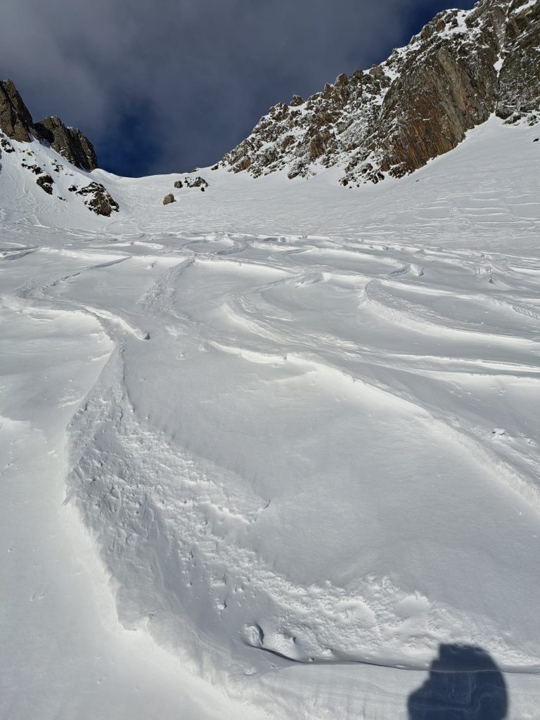A force que le vent souffle ces derniers jours, on voit un phénomène que je n’avais jamais vu avant : les traces de skieurs des jours précédents qui apparaissent en relief à la surface. Les skieurs qui sont descendus quand la neige était fraiche ont tassé la neige. Le vent a ensuite soufflé toute la neige légère autour ce qui fait que ce sont les traces des skieurs qui ressortent en relief.