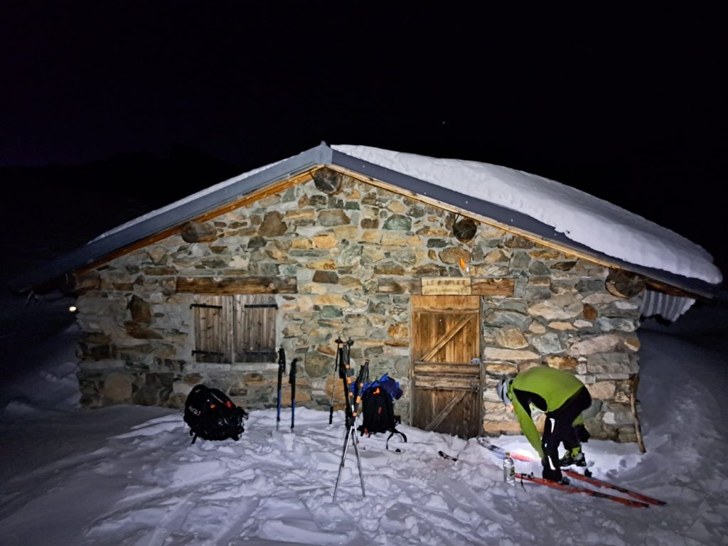 On préfère rester au fond du vallon pour ne pas suivre les pentes raides autour, qui ne nous inspirent pas confiance du point de vue des avalanches. On remonte un peu et on arrive au Merlet à la frontale. La journée a été très dure, avec 2000 m de dénivelé positif, mais de mon point de vue ça a été moins dur que la journée précédente. Dans la soirée, j’avoue à Vivien et Nicolas que je me suis demandé la veille, si je pourrais continuer après le 3ème jour qui m’a paru très dur. Mais maintenant tout roule.
