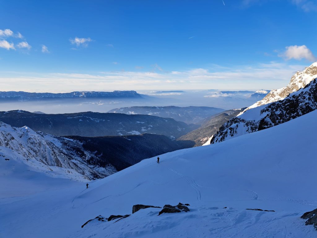 En redescendant, on arrive dans un vallon avec quelques coulées. On passe vite en y allant un par un. On voit bien le nord-ouest vers la Savoie. Les nuages sont bas donc on distingue le bout de la Chartreuse, le Granier et les Bauges, et même les immeubles de la station du Collet d’Allevard. Ça sent l’arrivée ! La neige n’est pas très bonne car soufflée mais la vue est magnifique.