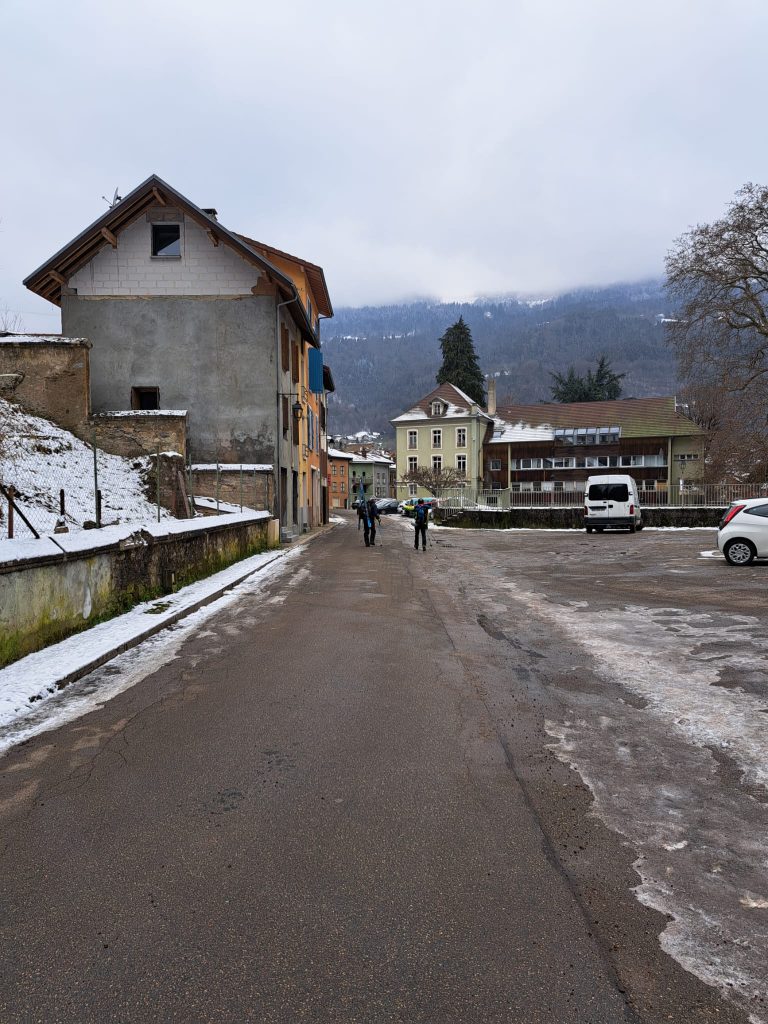 On marche entre deux et trois km en chaussures de skis, puis on arrive à Allevard.